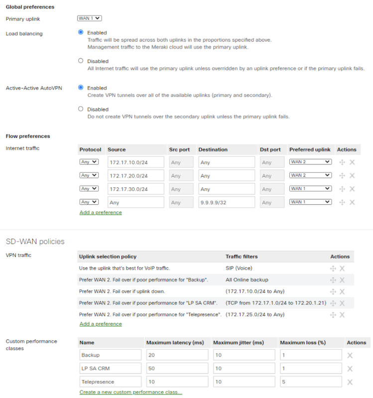 - WAN1が"Telepresence"というパフォーマンスクラスとして定義された閾値を満たす限り、WAN1から送信される