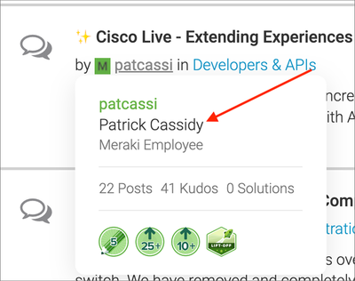 If you enjoy knowing more about fellow community members, we’ve added additional information to the user hover—first and last names. Members set their first and last names in their Meraki Community profiles for their names to appear.