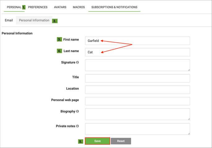 Next, from the My Settings page, select Personal > Personal Information > and add your first and/or last name in the fields. Make sure to click << Save >> when done—see example below: