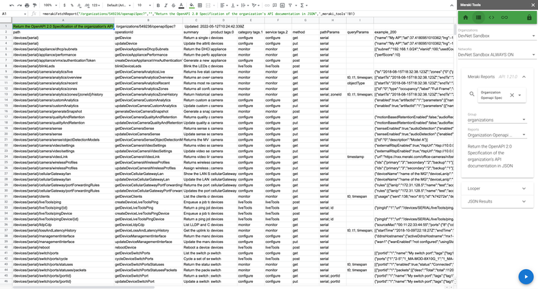 Now you can easily fetch Meraki data from a cell function and have the results inserted into the sheet.