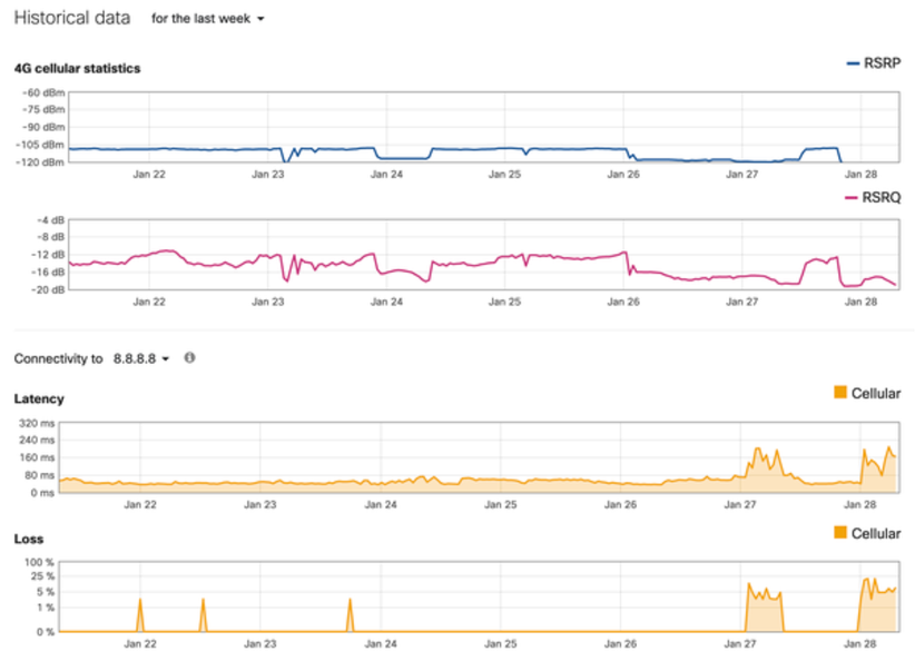 Customers will now be able to view cellular health data over time in the Meraki dashboard. This will allow them to easily monitor the signal level, signal quality, and connectivity with stats such as RSRP, RSRQ, Loss, and Latency.