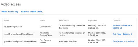 The video access page now includes a section for external live stream users. For each user that was shared a live stream link, the list includes their email, name, description, link expiration and the cameras they were given access to.
