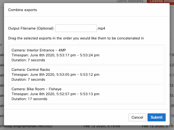 From this page, you can now select multiple exports from different cameras and combine them into one file for seamless playback. Simply select the files you want to include, and choose "combine selected exports". From there, you can rearrange files in your desired playback order and name the output file. The combined file will appear as a new item in the export table.