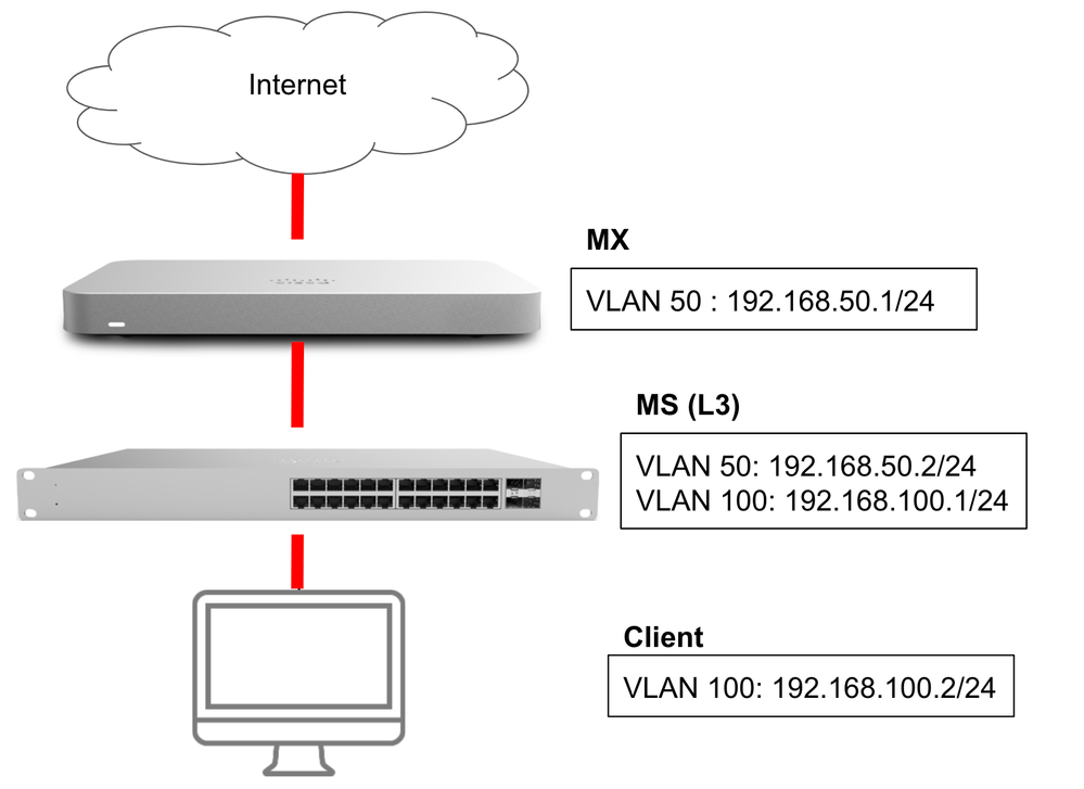 本記事でが、MX 及びMS が存在する構成において、MS でL3 ルーティングを有効にする構成について、