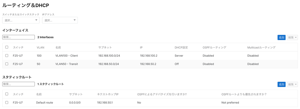 スイッチ> ルーティング&DHCP> インターフェイス> 追加