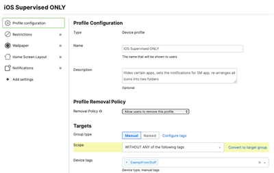 2. Tags are the answer. As the screenshot below, I've gone to profile configuration, and, because I want to EXCLUDE devices from this, I've selected WITHOUT ANY of the following tags and created a tag called ExemptFromStuff. I've then tagged the device with the same tag. This should exclude the device from this policy. Obviously, there's a tonne of flexibility here