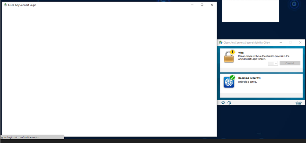 When a user logs in to anyconnect they are presented with the Azure sign-in. The user inputs their username and password and are prompted for MFA. After acknowledging MFA, the screen changes to white and basically freezes until the anyconnect client times out.