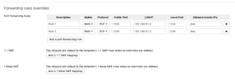 I have several networks set up using templates. And some sites have needs for port forwarding from the public IP address. Rules are configured in Security & SD-WAN > Firewall in the Forwarding rules overrides section.