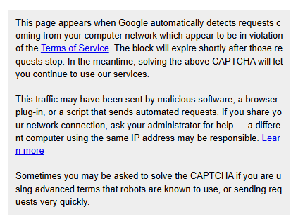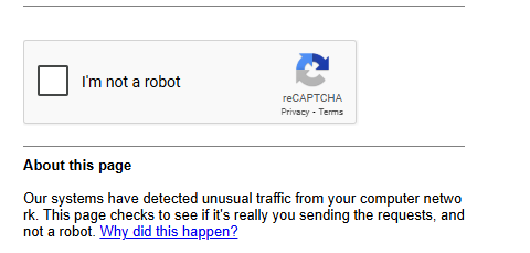 Here is the Google Support Document regarding this issue: Resolve Google Search’s "Unusual traffic from your computer network" message - Google Search Help