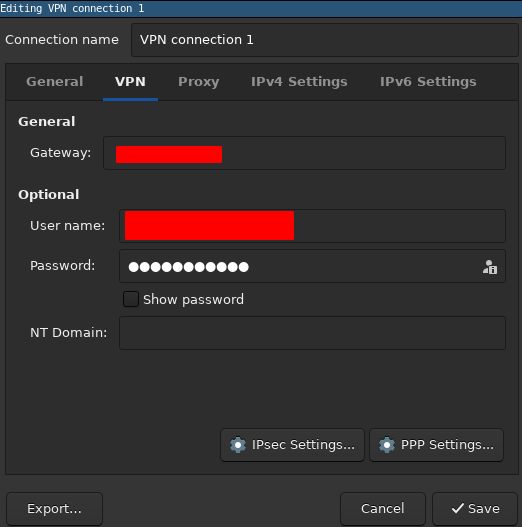 5. Create a VPN connection in nm-connection-editor and modify IPSec and PPP properties accordingly: