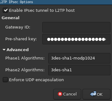 I switched from Mac to Linux recently and a thing I got stuck on for a while is the easy way to establish L2TP VPN connections from a mac to a Meraki firewall. On a mac it is very easy to set up, but on Linux I ran into some trouble getting it working. Now that is does work I'd thought I'd share a solution. Please note that this is a bit static and may break if future meraki updates changes cipher suite for example.