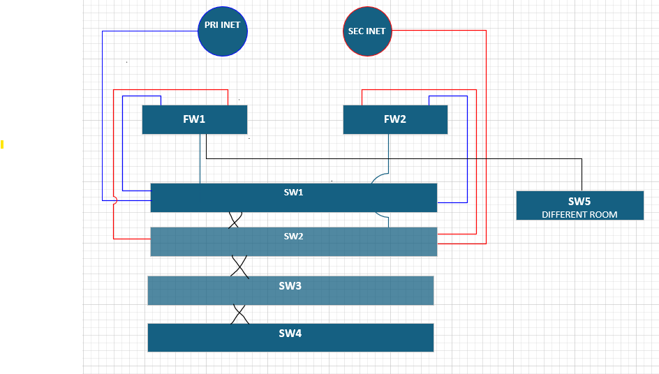 Now when I add SW05- it is uplinked currently only to FW1 in the diagram. How is the correct way to link it to FW1 and FW2 so it works in a high availability scenario?