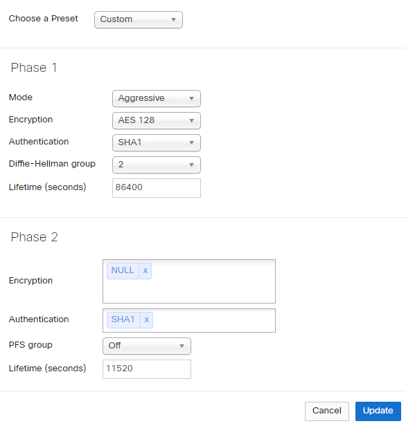 under non Meraki section enter the name for your zscaler node and the public ip of your zscaler node.zscaler tunnel.PNGnow the ipsec custom policies i have configured like below.