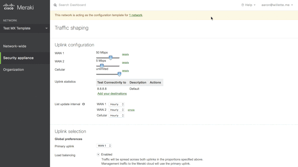 They pushed an MX template enhancement last week that allows child MX networks' uplink bandwidth sliders to override the template uplink settings. This unlocks the ability to optimize the WAN bandwidth settings on a per-site basis.