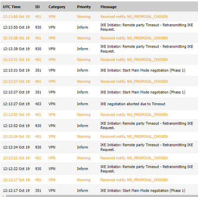 The IKE Initiator: Remote Party timeout log shows several timeout messages and IKE negotiation aborted due to timeout after a short delay, indicates that there is a communication problem or the Initiator and Responder are unable to complete the Phase 1 negotiations.