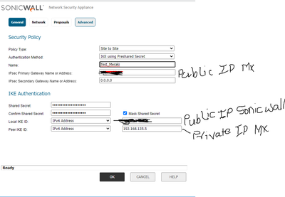 Also, remote ID on Meraki ( public IP of sonicwall ).