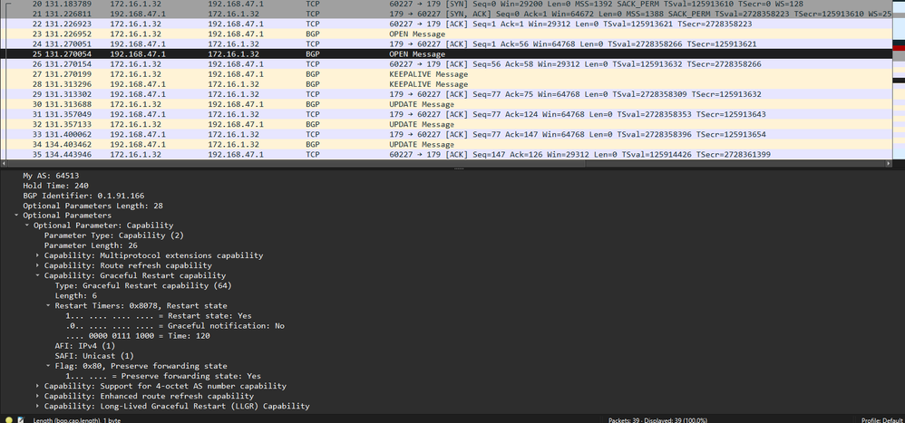 You should be able to know the optional parameters that Meraki supports by looking at the BGP open message. I went ahead and configured BGP on 2 MXes and looked at the BGP OPEN message after restarting one from the dashboard and it appears to show that the MX supports and participates in Graceful Restart