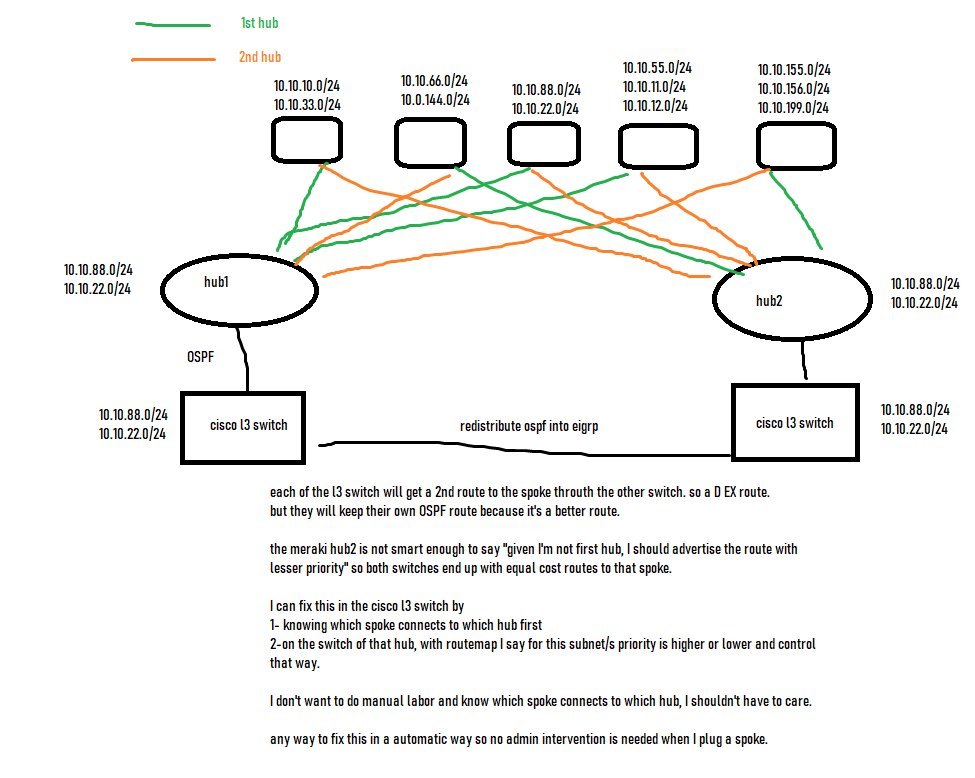 I need a way without doing any manual entry in the cisco core network for the network to know that to reach spoke the network should prefer to route through hub1. please see attached picture.