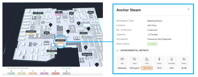Additionally, MT15 is integrated with Cisco Spaces to plot CO2 information against a floor plan and intuitively summarize metrics for facilities managers to use.