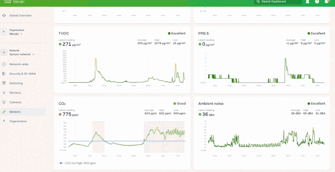 Meraki dashboard charts offer historical CO2 data, as well as data on the five other environmental metrics, across customizable periods of time. To draw the user to time periods of interest, chart backgrounds are shaded in red when the sensor is an alerting state,