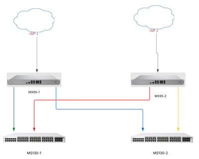 - We have two different ISP's connected each to two (2) different Meraki MX-95