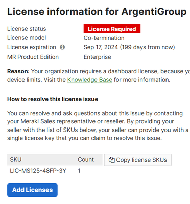 Hola, estoy reemplazando un switch MS125-48FP por otro del mismo modelo ya que el mismo se daño, segui el procedimiento de solicitud de RMA y ya recibi el nuevo equipo, ahora lo estoy configurando pero en el dashboard me aparece que falta una licencia: