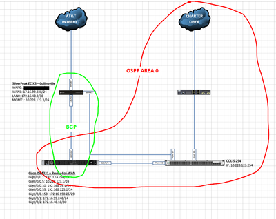 At Location 1 and Locations 4-9, the EdgeConnect appliance is connected to the Cisco ISR over a BGP connection. As stated previously, the ISR is also configured in OSPF Area 0 to connect to the other locations. I have attached a crude diagram to hopefully show this clearly.