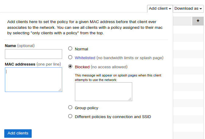 Thereafter you may download the list as CSV file. Filter the content in an Excel Sheet as desired. Copy the List of MAC Address you need to block and Apply "Blocked" Policy for them.